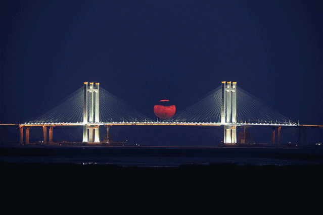 上图:昨天18点38分,农历八月十六的月亮从泉州湾大桥两座主塔中间升起。(注:本图为一次曝光而成)