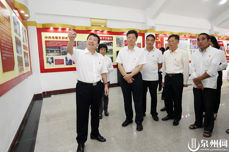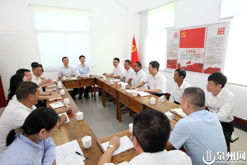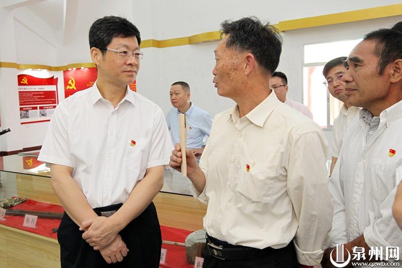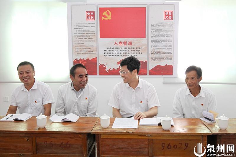 来到德化县水口镇昆坂村坂里,群山环抱下的中共福建省委旧址映入眼帘,绿色风光与红色文化交相辉映。在这里,康涛一行与当地党员干部一起瞻仰了中共福建省委旧址,聆听先烈故事,重温革命历程,共迎新中国成立70周年。在陈列馆会议室,大家围坐在一起,围绕“悟初心、守初心、践初心”主题展开讨论。“践行初心只有起点没有终点”“村干部的初心就是把村民的事当自家的事”“老党员的信念不变,要永远跟党走”……水口镇党委书记赖诗坛、昆坂村党支部书记陈忠华,当地老党员毛福泽、黄长评、黄岁远,以及市委办机关党支部党员代表等,结合个人经历,畅谈了对初心使命的认识和体会,自我检视“当初入党为什么、现在在党做什么、今后为党留什么”,现场气氛活跃。康涛认真听取发言,不时和大家交流分享,了解群众需求、百姓关切,探讨解决之道。