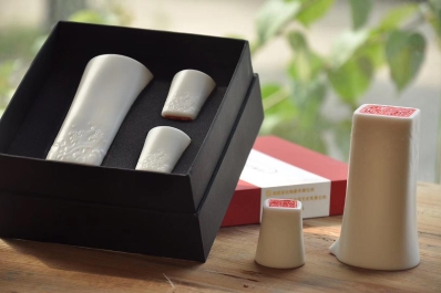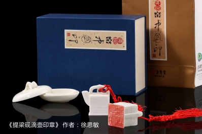 采用德化白瓷胎质,洁白坚实,外施白釉,底部露胎雕刻专属设计的书法印文;方形书箱,竹节提梁,具有学富五车与节节高升的美好寓意。器身模印回纹,象征文运通达、生生不息。每方印章历经多道手工工序制作,并经高温烧制而成,件件是孤品。