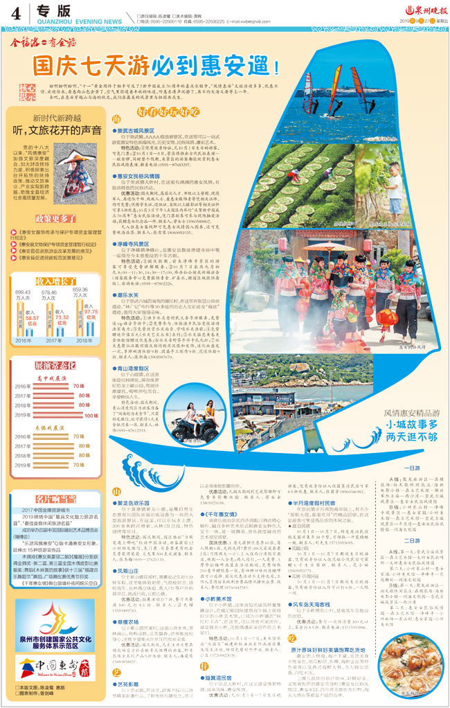 盼啊盼啊盼啊,“十一”黄金周终于触手可及了!新中国成立70周年的喜庆长假中,“风情惠安”文旅活动多多、优惠不停。欢迎你来,看惠西山色金黄了,空气里弥漫着丰收的味道,听惠东涛声沉静了,再不约大海又要等上一年。