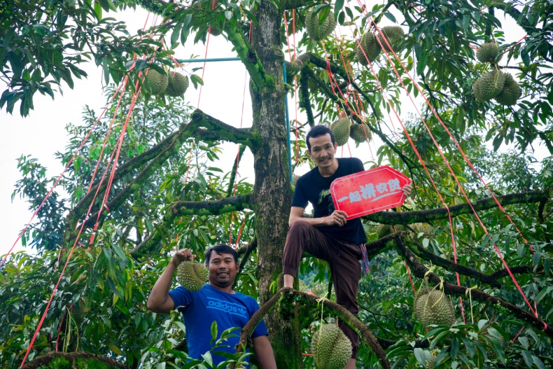 在泰国优质榴莲产区,农户正采摘新鲜的榴莲。