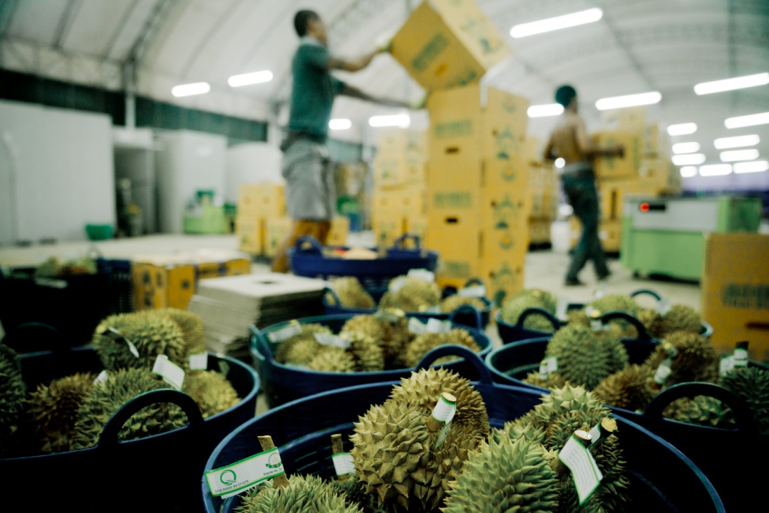 向中国出口榴莲的工厂需要向泰国政府申请专门的牌照,具备卫生检疫标准才能开设,所有榴莲会在入库进行第三次品控,装箱打包过程中再进行第四次品控后贴上检验标签后,才能发货出口到中国。