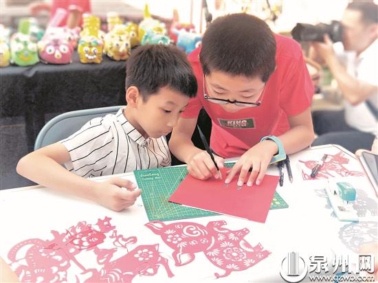 巧手迎国庆,童心创未来。9月28日,“礼赞新中国·拥抱世中运”晋江市第二届少儿文创市集“开市”。图为儿童剪纸。(许雅玲 摄)
