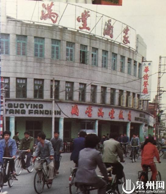 泮宫口附近还曾有一家泉州人熟知的满堂饭店,当年的门牌号码是中山中路1-5号。楼顶是“满堂酒家”几个大字,侧面挂着“二楼华侨餐厅”招牌,一层门面则写有“国营满堂饭店”及拼音。