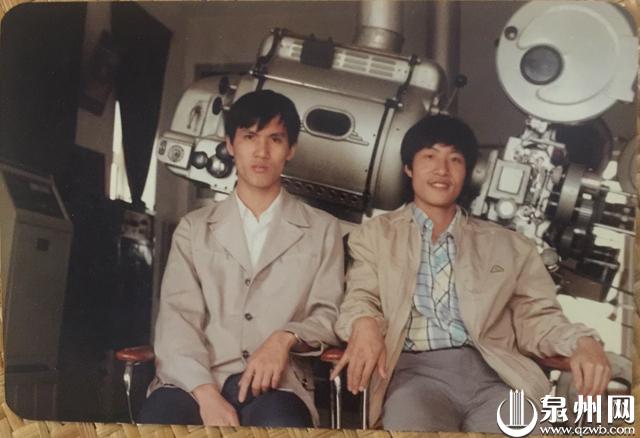 杨茂盛(左)曾在人民电影院担任过放映员,这是当年在人民电影院放映室,南安邱店某部放映员来学习放映技术时的留影。(杨茂盛/供图)