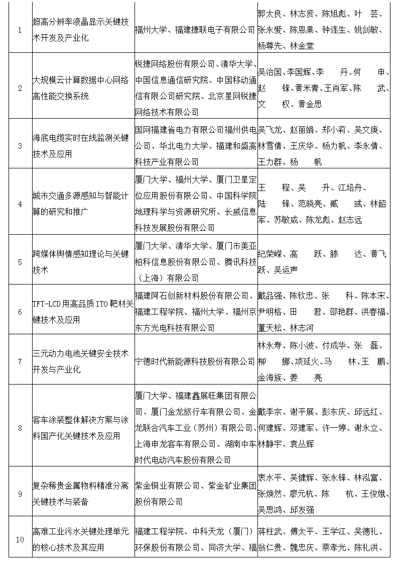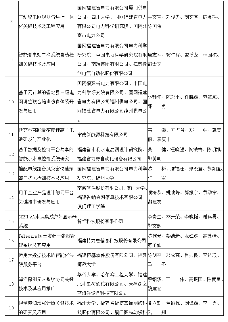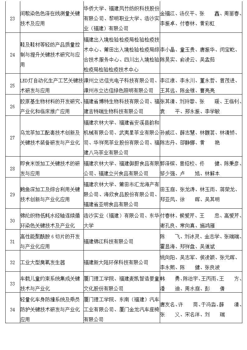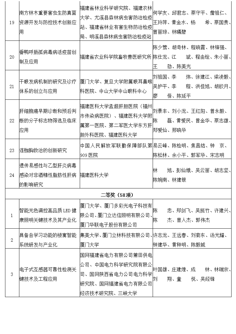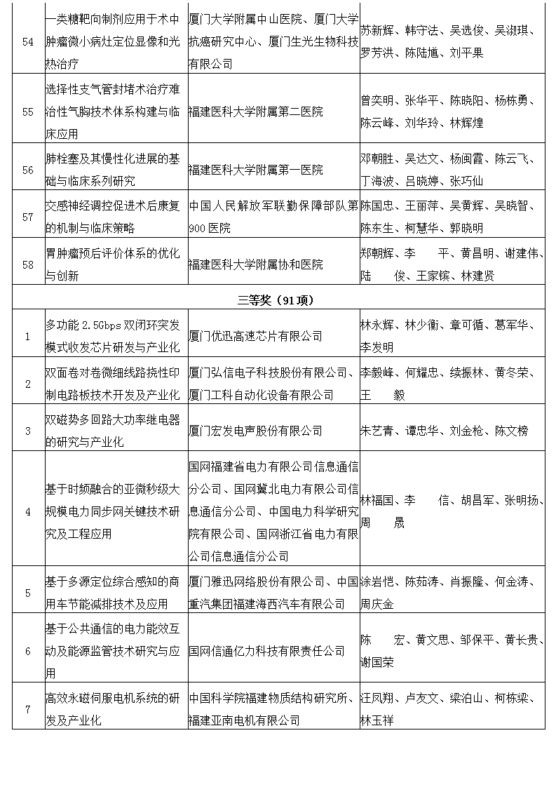 四、授予“超高分辨率液晶显示关键技术开发及产业化”等24项成果福建省科学技术进步奖一等奖,授予“智能光色调控高品质LED健康照明关键技术及其产业化”等58项成果福建省科学技术进步奖二等奖,授予“多功能2.5Gbps双闭环突发模式收发芯片研发与产业化”等91项成果福建省科学技术进步奖三等奖。