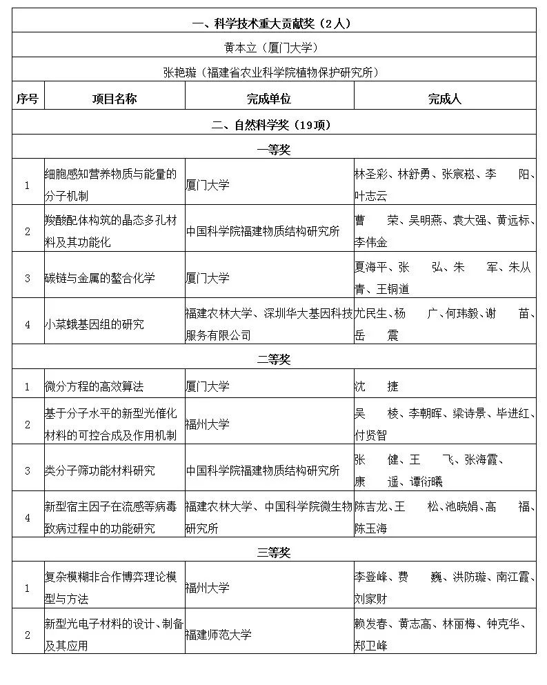 近日,福建省人民政府印发了《关于2018年度省科学技术奖励的决定》(以下简称《决定》),为深入贯彻习近平新时代中国特色社会主义思想和党的十九大精神,大力实施创新驱动发展战略,营造有利于创新创业创造良好发展环境,根据《福建省科学技术奖励办法》的有关规定,省科学技术奖励委员会组织对2018年度福建省科学技术奖进行评审,经省委研究,省政府决定对2018年度在科学技术进步活动中作出重要贡献的科学技术人员和组织给以奖励,为获奖者颁发奖状、证书和奖金。具体如下: