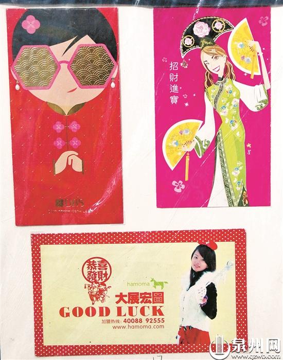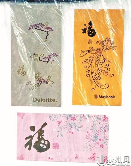 老郑说,新加坡、马来西亚一带的华人、华侨经商的多,他们经常会印一些红包封送给客人,红包封正面图案创意各不相同,但大多是一些恭喜、祝福的文字和画面,背面则会印着本公司、商行的名字、联系方式等。