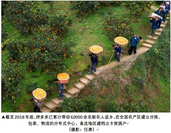 相关数据显示,截至2018年底,拼多多已累计带动62000余名新农人返乡,在全国农产区建立分拣、包装、物流的分布式中心,直连地区建档立卡贫困户,平台及新农人直连的农业生产者预计超过700万人。其中,在国家级贫困县,此类新增产业链预计带动当地物流、运营、农产品加工等新增就业岗位超过30 万个。