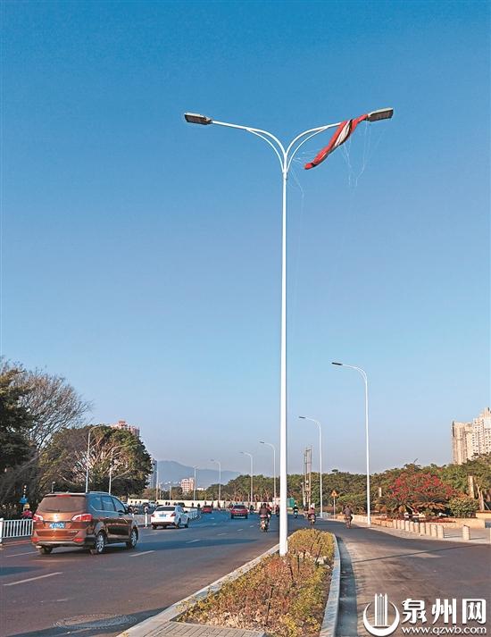 在昨日的“总编接线”中,读者张先生通过“96339记者热线”官方微博发来图片反映,在鲤城区笋江路石笋公园门口,有一盏路灯被一大块红布缠绕,应该是大型充气球或风筝之类的东西,这样随风飘扬容易引起路灯短路。万一被风吹落,盖在行驶中车辆的前挡风玻璃上,后果将不堪设想,希望部门尽快派人处理一下。