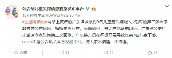 18日,公安部儿童失踪信息紧急发布平台官方微博发布消息:网络上流传的广东增城被拐9名儿童案件嫌疑人“梅姨”的第二张画像非官方公布信息,梅姨是否存在,长相如何,暂无其他证据印证。广东省公安厅未邀请专家对梅姨二次画像,广东警方仍在积极开展寻找其余7名儿童下落。ccser不是公安机关官方权威平台,请大家不信谣、不传谣。