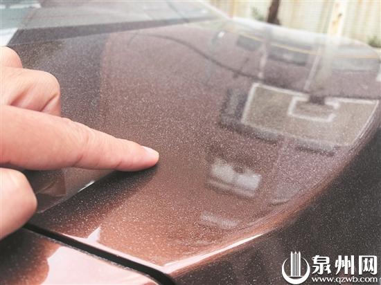 昨日上午9时许,记者来到丰泽交警大队。不少车主正讨论着天降油漆的事件。记者在现场看到,多辆车子或多或少被斑驳的油漆覆盖。“我开始以为是灰尘,去洗车后才发现洗不掉。”市民吴先生说,前天,他就看到车子上面有白色斑驳的痕迹,除了车身,玻璃上也有,对行车视线有影响,他赶紧去洗车,但是,洗完车后,情况并未好转,白色斑驳的油漆更加明显。