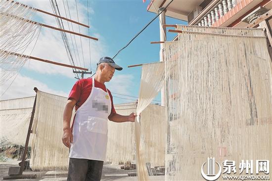 陈台川的家门口有个宽敞的大院子。凌晨4点多,他和妻子起床,和面、阴面、切面、搓大条、搓二条、盘条、上筷子、阴条、分筷子、再阴条、出筷子、上大架、抻面、晾晒……经过一道道工序,面线散发出阵阵香气。“现在老伴要照顾孙女,我们一天只做一百来斤,过去做两三百斤时,凌晨两点就得起床。”陈台川说,晾晒后还有多道后续工序,直到下午才能完工。
