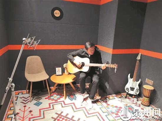 张国滨在工作室内弹吉他