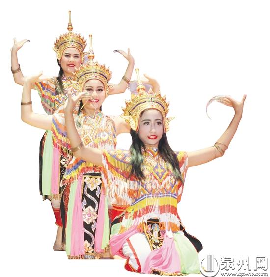 古典动听的《清迈玫瑰》舞曲响起,身着盛装的演员们迈着轻盈的步伐出场,为观众带来一首多用于吉祥喜庆活动中表演的《克汗多克舞》。“克汗多克舞”是一种新创的舞蹈,它的创作灵感源于泰国人用“克汗多克”容器祭拜清迈的城市支柱“因塔印城柱”。演员们用头、手、脚的优雅动作表达了喜庆的气氛,展现了舞者的曲线美,赢得了阵阵掌声。接着,泉州艺术学校舞蹈团的演员们上场,她们如一朵朵红莲,含羞于碧绿之中,掩面于莲叶左右,为观众们带来动人的群舞《六月清荷》。第三个充满异域风情的舞蹈《诺拉·维克鲁和萨特·查特里舞》,由3位头戴金冠、十指戴着指甲套的泰国小演员表演。在1个半小时的演出中,泰国演员们还表演了《击剑》《甜蜜蜜》《长鼓舞》《泰国四区》等4首歌舞。泉州艺术学校舞蹈团则带来戏曲舞蹈《踏春》、南音乐舞《出画堂》、歌舞《惠女风情》、南音谱表演《百鸟巢图》等充满闽南特色的精彩节目。不同风格的歌舞轮番上场,观众们看得专注、陶醉其中。