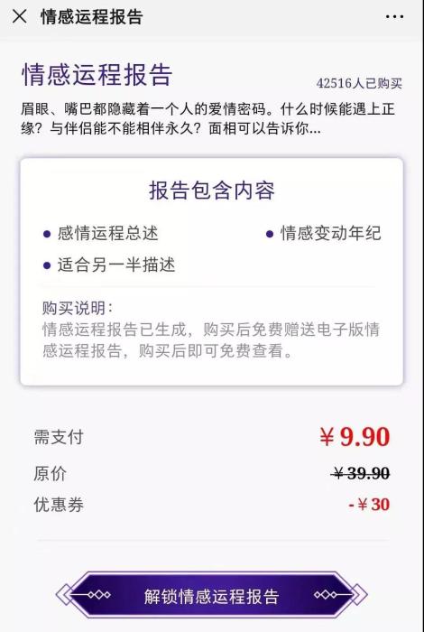 不少“AI算命”都以免费来吸引用户。记者上传了照片,很快便生成了分析报告。但这份报告是不完整的,如果想进一步了解情感事业等子报告,需要另外付费。事业和情感报告显示价格均为9.9元,分别有26351人和42516人购买过,以此计算这两个项目获利近70万元。