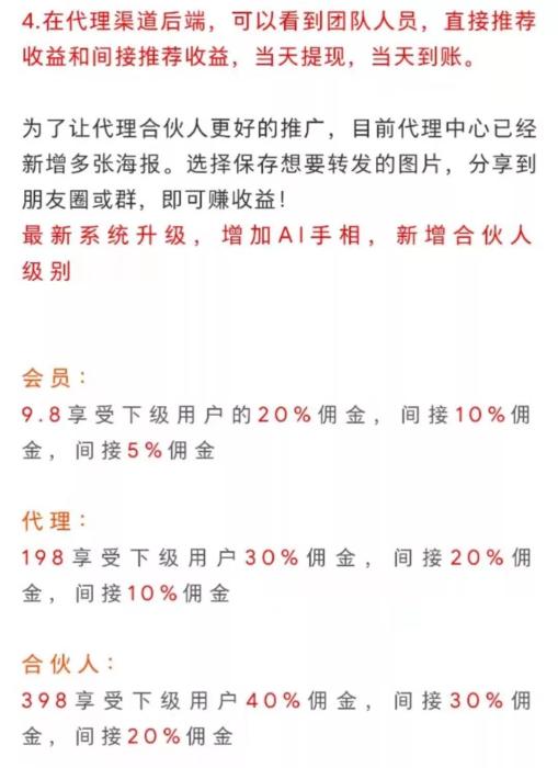 还有的可以发展下线,获取佣金。推广页面显示,从会员到合伙人,支付价格从9.8到398不等,获得的下级用户佣金比例也从20%到40%不等。