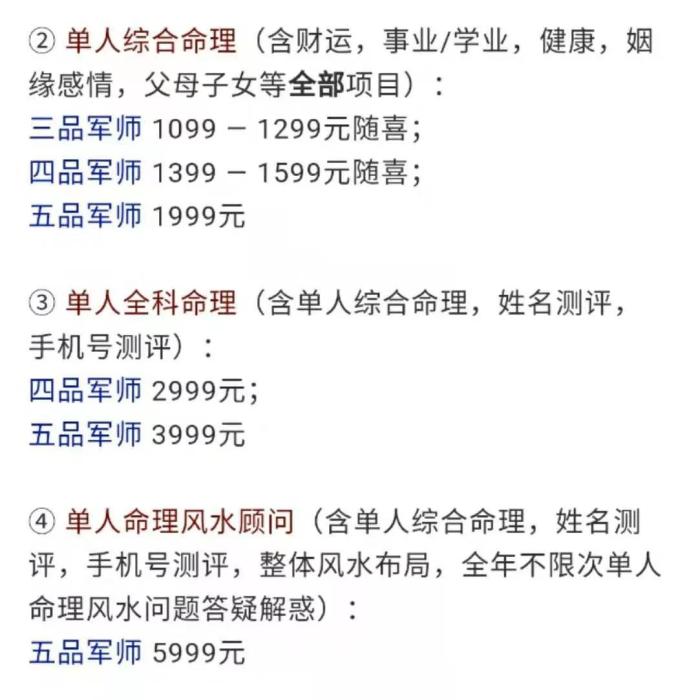 记者咨询客服发现,命理测算按照不同等级“军师”收费,请最高级的五级军师担任个人命理风水顾问(含单人综合命理,姓名测评,手机号测评,整体风水布局,全年不限次单人命理风水问题答疑解惑)收费达5999元。