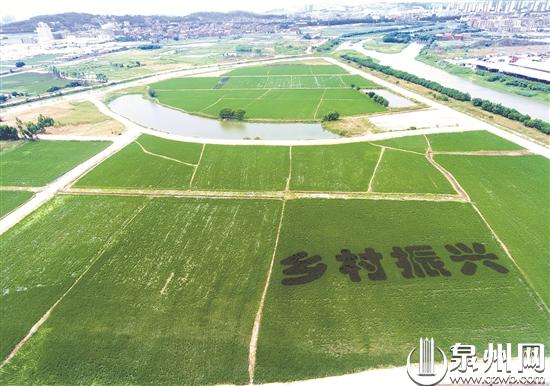 晋江九十九溪田园风光水稻种植(稻田彩绘)项目组在2000多亩的连片水稻田上进行稻田彩绘,设计了“乡村振兴”等7幅彩绘图案。 (秦越 摄)