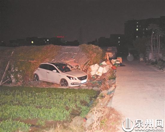 事发后,民警接警赶到现场,发现一辆白色现代轿车掉在农田内,一间水泥瓦片搭建的简易房被撞塌,现场一片狼藉。