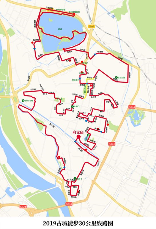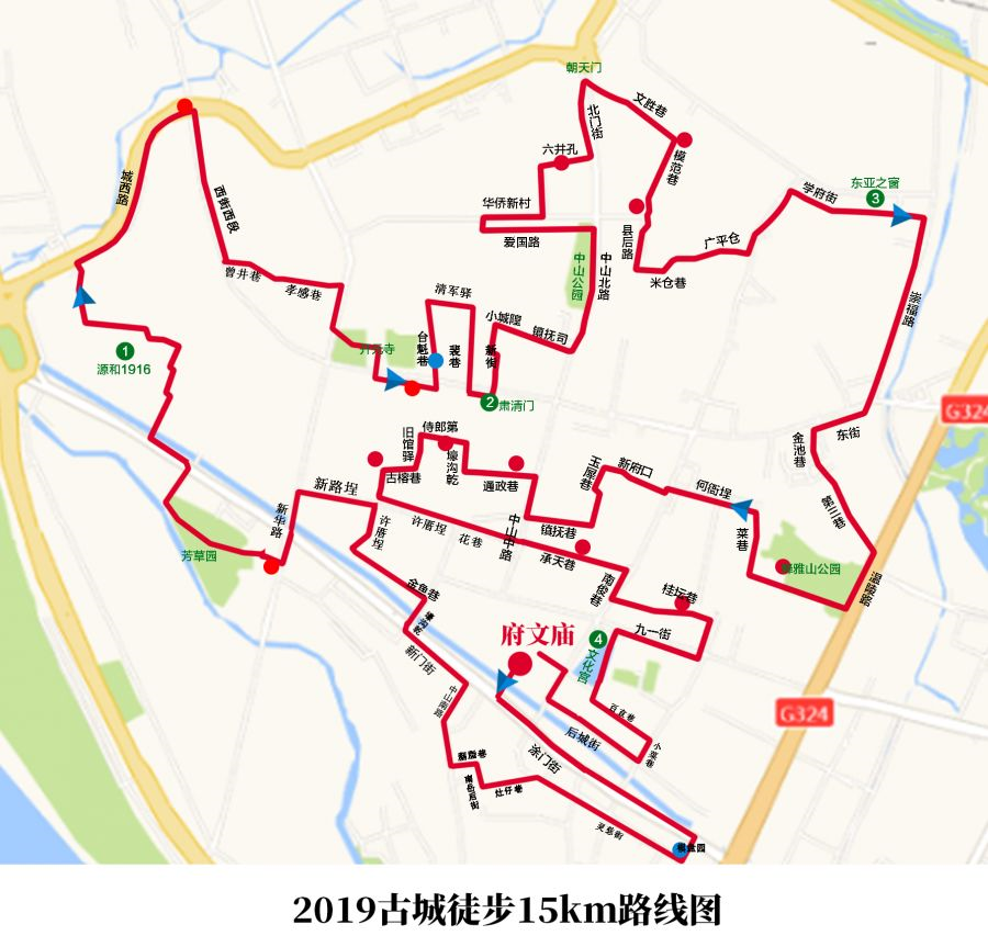 府文庙→涂门街→棋盘园→灵慈街→灶仔巷→南岳后街→胭脂巷→中山南路→新门街→壕沟乾→金鱼巷→许厝埕→新厝埕→新华路→农商银行(芳草园支行)→芳草园→甲第巷→新门街→源和1916→城西路→农商银行(北峰支行)→西街西段→曾井巷→孝感巷→开元寺→→西街游客中心→台魁巷→粘氏故居→清军驿→裴巷→肃清门→新街→小城隍→中山北路→爱国路→裴巷→华侨新村→六井孔→北门街→朝天门→文胜巷45号→模范巷→白耇庙→县后路→米仓巷→广平仓→南俊新街→学府路→东亚之窗→崇福路→东街→金池路→第三巷→温陵北路→释雅山公园→释雅山公园后门→菜巷→何衙埕→新府口→后巷→镇抚巷→中山中路→通政巷→苏廷玉故居→濠沟墘→井亭巷→侍郎第石桌→旧馆驿→古榕巷→古榕巷公园→许厝埕→花巷→承天巷→承天巷沟尾下路口→南俊路→桂坛巷→五中门口→九一街→文化宫→后城街→府文庙