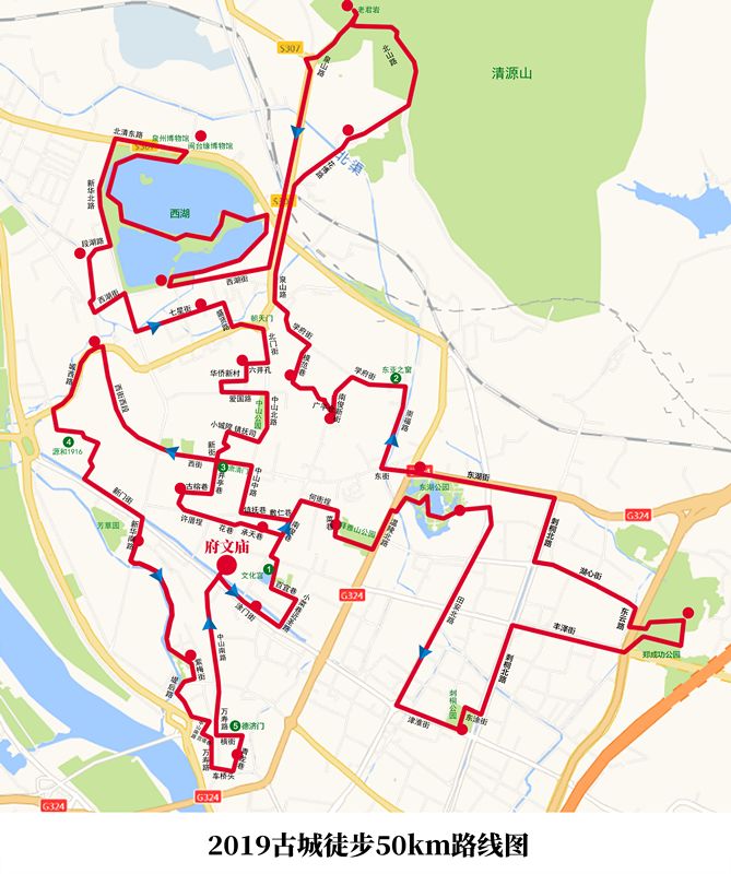 涂门街→锡兰侨民旧居→近圣路→小菜巷→百宜巷→文化宫→九一街→南俊路→何衙埕巷→菜巷→释雅山公园后门→温陵北路→东湖公园西门→东湖公园东门→田安北路→津淮街→刺桐公园南门→刺桐公园北门→东涂街→刺桐北路→丰泽街→过天桥→郑成功公园到铜像→东云路→湖心街→刺桐路→东湖街→农商银行总行→东街→崇福路→东亚之窗→学府街→南俊北路→农商行儿童银行→广平仓→米仓巷→希望小学→模范巷→学府街→泉山路→花博路→北山路→清源山南门→清源山(老君岩)→泉山路→西湖街→西湖南门→西湖北门→闽台缘博物馆→北清东路→新华北路→段湖路→段湖古地→西湖街→新华北路→七星街→剑影幼儿园→盛贤路→城北路→朝天门→北门街→六井孔→华侨新村→爱国路→北门街→中山公园→镇抚司(小城隍)→新街(小西埕)→西街→中山中路→镇抚巷→敷仁巷→南俊路→承天巷→沟尾下路口→花巷→许厝埕→古榕巷(古榕巷公园)→井亭巷→肃清门→西街游客中心→西街西段→农商行北峰支行→城西路→源和堂1916→新门街→芳草园→农商行芳草园支行→新华南路→紫梅街→溪灵宫→五堡社区音乐文化广场→义全街后段→堤后路→中山南路→宫塔巷→万寿路→车桥头→青龙巷→李妙森故居→横街→万寿路→德济门→中山南路→府文庙