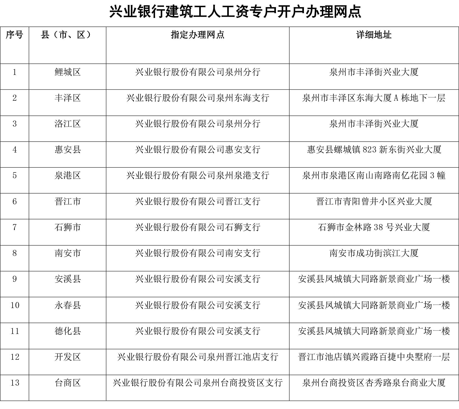 目前,兴业银行泉州分行各指定网点均可为建筑企业办理开设工资专户业务。