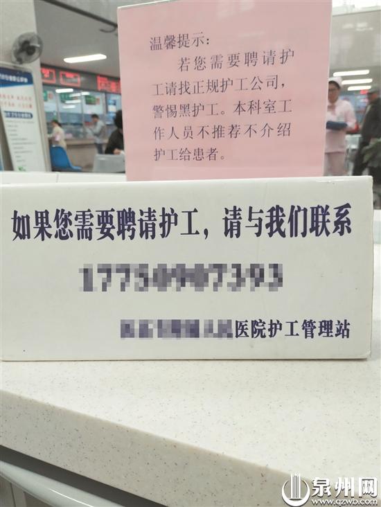 近日,记者走访泉州数家医院调查护工现状发现,在患者住院时,很多家属有请护工的需求。有的请到正规持证护工,服务质量较有保障,遇纠纷也有护理公司和医院出面协调;而有的或被忽悠或图便宜,口头雇佣了不正规的“黑护工”,一旦出问题,家属就只能“哑巴吃黄连”,麻烦不断。患者和家属不放心,医院也无法安心。
