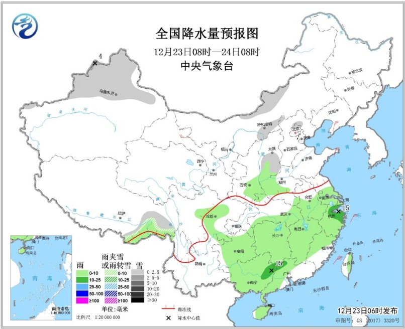 12月23日08时至24日08时,新疆北部、内蒙古中部、山西中南部、河北中部等地的部分地区有小到中雪。江淮、江南、华南中西部、四川盆地中南部、贵州等地的部分地区有小到中雨。甘肃河西、辽东半岛、山东半岛等地的部分地区有4~5级风(见图2)。