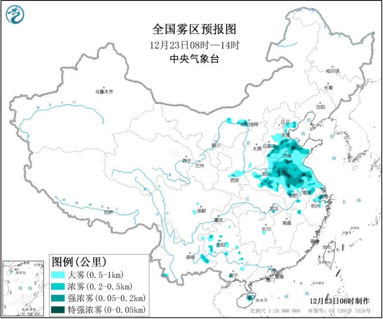 23日受弱冷空气影响,华北中南部、黄淮东部的霾天气略有减弱,黄淮西部、汾渭平原等地霾天气维持。24日,华北中南部、黄淮空气污染气象条件再次转差,有中至重度霾。25日,受较强冷空气影响,上述地区霾天气自北向南逐渐减弱消散。此外,23日早晨至上午,河北东部和南部、山东中西部、河南中东部、安徽中北部、江苏、上海、浙江北部、贵州南部等地的部分地区有大雾,其中,河北东南部、山东西北部和南部、河南东部、安徽北部、江苏北部、上海等地的部分地区有能见度不足500米的浓雾,局地能见度不足50米(见图1)。中央气象台12月23日06时继续发布大雾橙色预警。