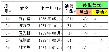 泉州网12月24日讯(记者 卢珊珊 通讯员 赵美媛)近日,泉州市公安局交警支队向社会公布2019年11月份以来的终生禁驾名单。据了解,被吊销机动车驾驶证且终生禁驾的5名驾驶人,有4人因交通肇事后逃逸构成犯罪被终生禁驾,1人因醉酒驾驶机动车发生交通事故构成犯罪被终生禁驾。