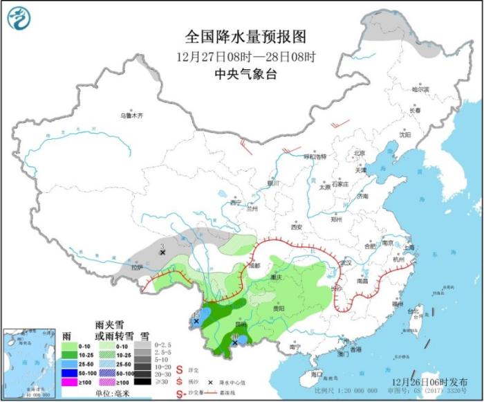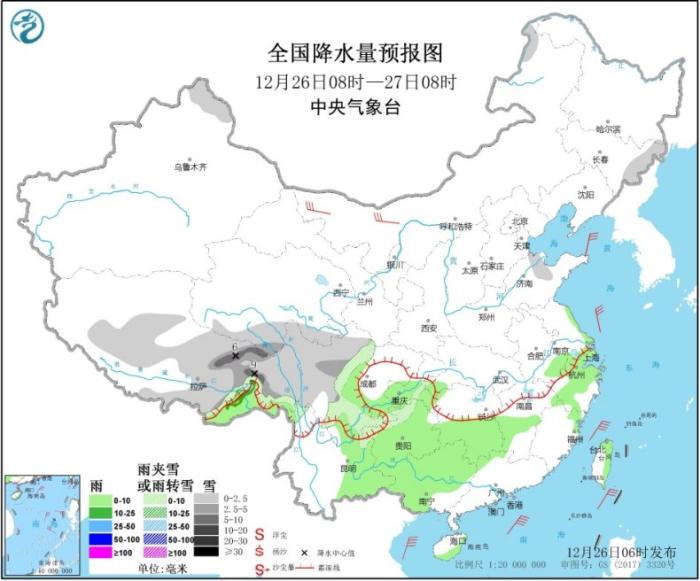 图2 全国降水量预报图(12月26日08时-27日08时)