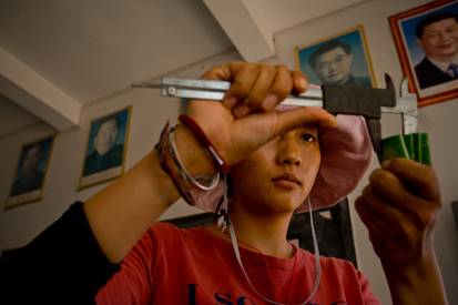 △龙陵基地的技术员测量橙皮厚度,科技种植是云冠橙品质稳定的保障。
