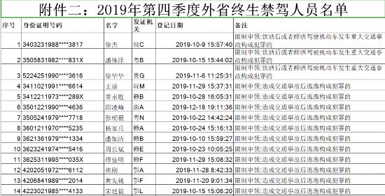 2019年第四季度外省终生禁驾人员名单