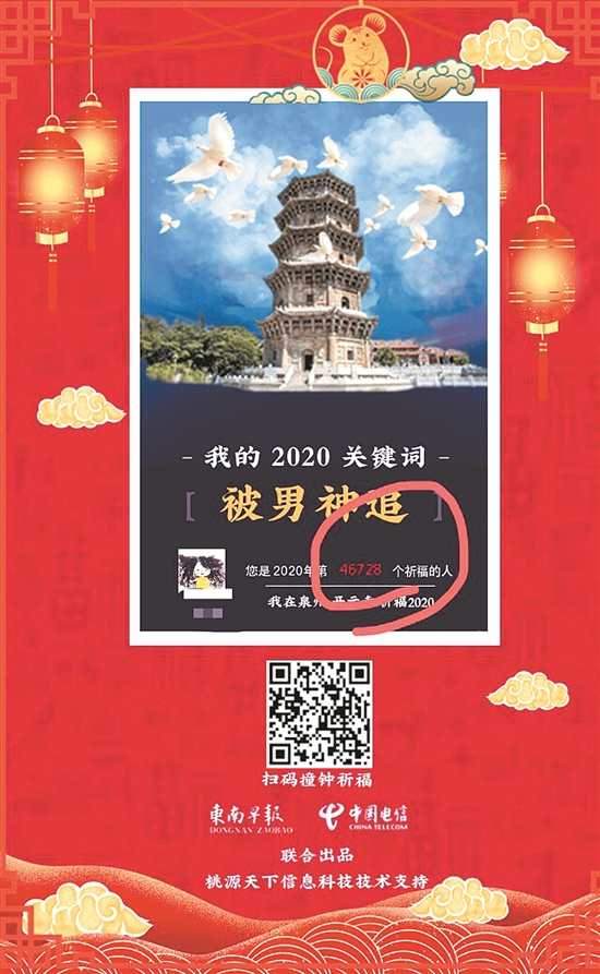 先游历泉州,一睹泉州名胜古迹,然后在开元寺、关帝庙、清水岩、清源山、洛阳桥、仙公山六个地点中选择自己心仪的地点撞钟祈福。悠扬雄浑的钟声回荡三声之后,就能抽取属于自己的2020年关键词。“暴美”“暴富”“暴瘦”网友们的关键词形成的红色海报红极朋友圈。