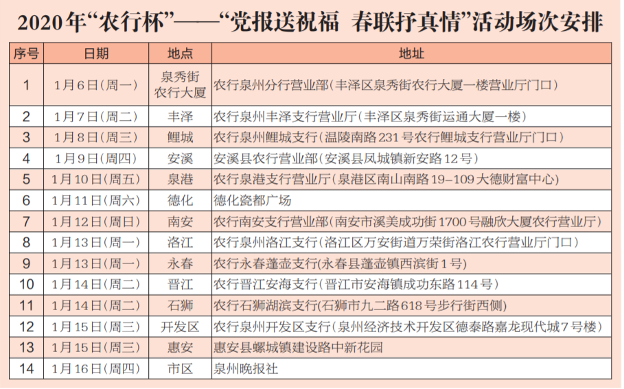 2020年“农行杯”——“党报送祝福 春联抒真情”活动由泉州晚报社、中国农业银行泉州分行、泉州市文联联合主办,泉州市书法家协会、泉州市青年书法家协会、泉州市老年书画研究会、泉州老年大学、泉州历史文化中心、泉州晚报社书画研究院协办。今年的活动将延续往年传统,除了丰泽、鲤城、洛江等中心市区,也将走进安溪、德化、永春、惠安、泉港、晋江、南安、石狮、泉州开发区等县(市、区),共计11天14场,每场组织多名书法家为读者书写春联。活动将持续到1月16日,每场为期半天,每天上午9点30分开始。我们为读者朋友精心准备了大对、小对、“福”字联等多种款式的春联1万副,欢迎大家到现场免费索取。
