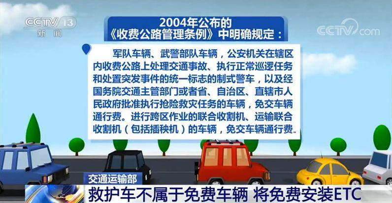 交通运输部公路局路网管理处处长 顾志峰:从目前的情况来看,有一些个别省份对救护车是实行延续过去的办法免费的,但是从我们国家的行政法规来讲,它没有规定。