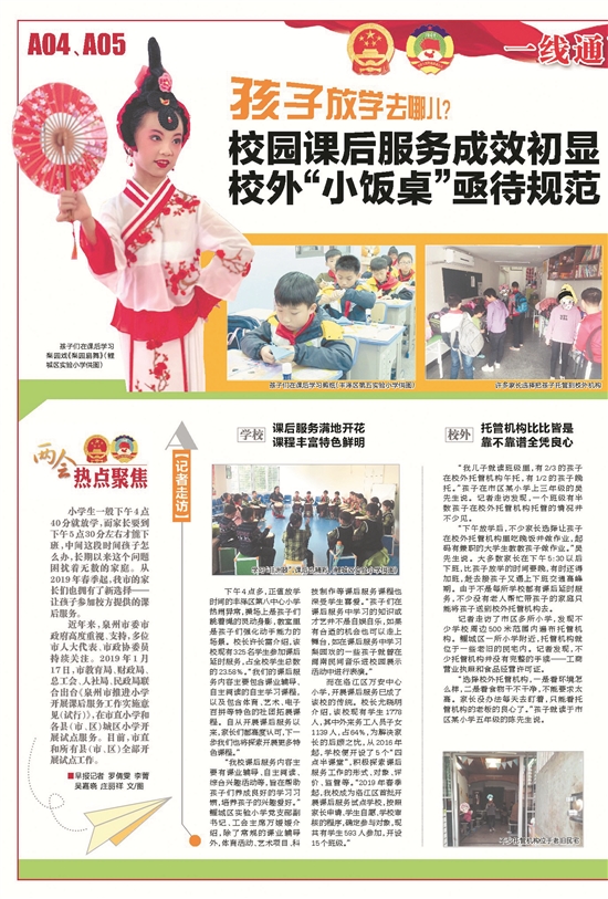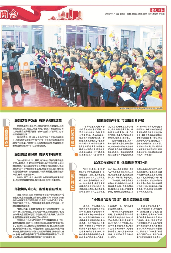 泉州网1月8日讯(记者 李菁 罗倩雯)学校放学了,家长还没下班,孩子怎么办?东南早报聚焦校园课后服务的相关报道引起了社会各界热议。对此,致公党泉州市委员会提出,泉州中小学课后延时服务应建长效机制,建议“以学校牵头引领,第三方服务机构为主,志愿者有益补充”,推送校园课后服务进一步发展。