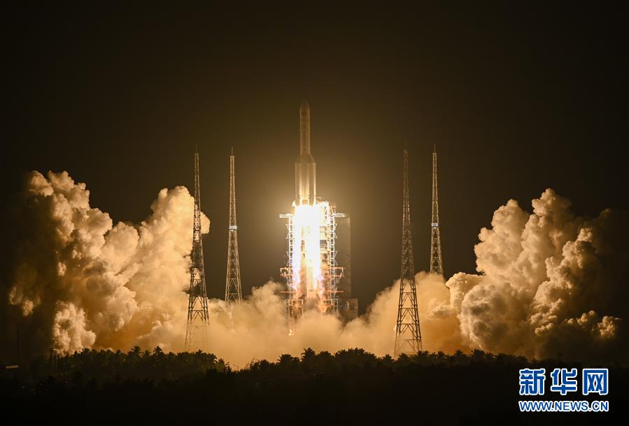 2019年12月27日20时45分,长征五号遥三运载火箭在中国文昌航天发射场点火升空。 新华社记者陈晔华摄
