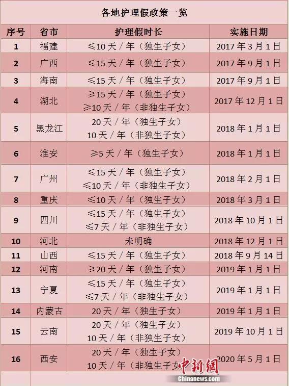 据不完全统计,截至目前,已至少有福建、广西、海南、湖北、黑龙江、淮安、广州、重庆、四川、河北、山西、河南、宁夏、内蒙古、云南、西安在内的16地出台了“独生子女护理假”相关的具体规定。