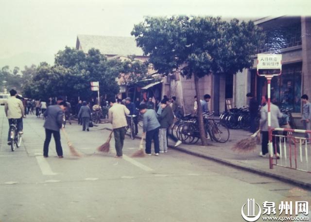 上世纪70年代,华侨中学学生在钟楼百货大楼外面的街道上打扫卫生。