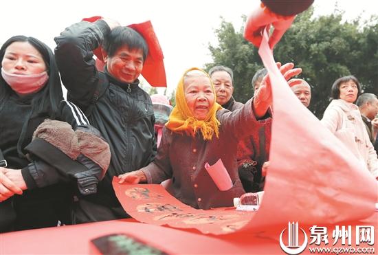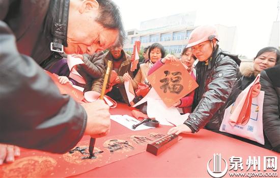 本报记者、泉州市青年书法家协会主席张文璟刚写了几个“福”字,就马上有了响应,接连有几位市民凑上来。“老师,请帮我写几副吧,您的字笔力遒劲,畅快飘逸。”一位老先生满是诚恳。张文璟一脸热诚地说:“您放心,我马上帮您写。”