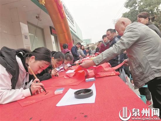 惠安活动现场,亦是人来人往,热闹非凡,大家争相请书法家写联。书法家们运笔如飞,行书、隶书、楷书……不一会儿,一个个高雅飘逸的“福”字、一对对寓意吉祥如意的春联就跃于红纸之上。
