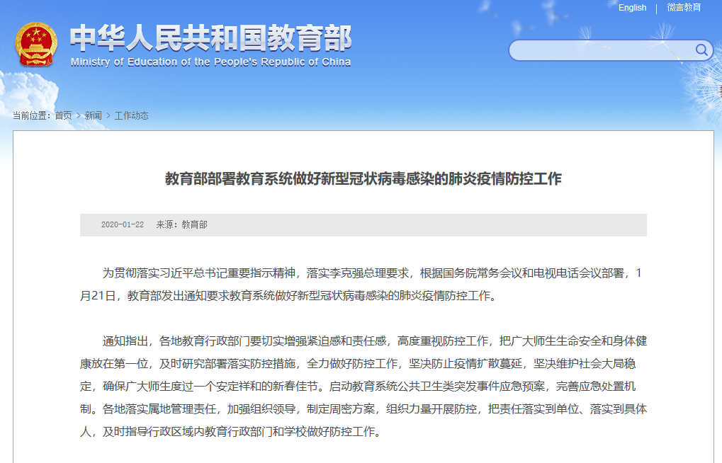 教育部部署教育系统做好新型冠状病毒感染的肺炎疫情防控工作