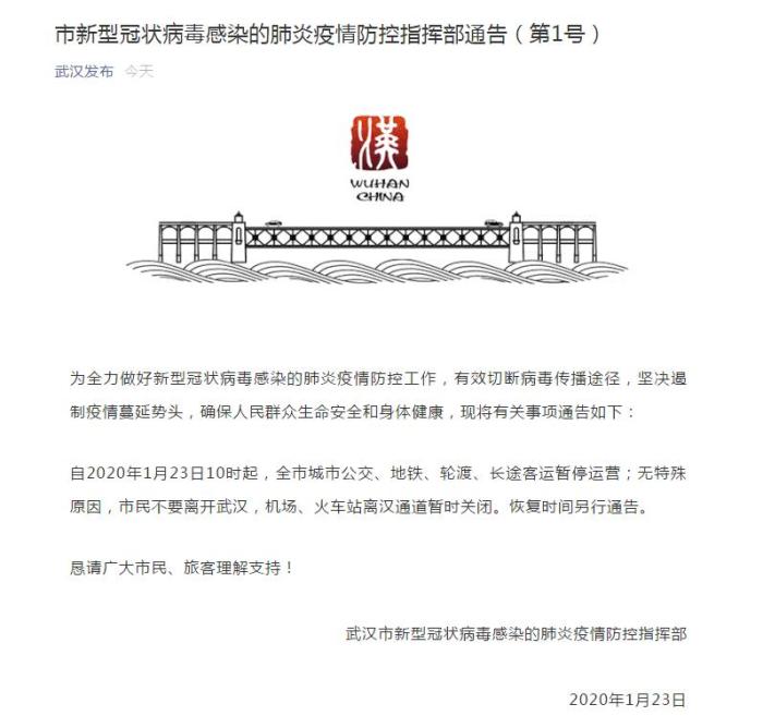 公告称,为全力做好新型冠状病毒感染的肺炎疫情防控工作,有效切断病毒传播途径,坚决遏制疫情蔓延势头,确保人民群众生命安全和身体健康,自2020年1月23日10时起,全市城市公交、地铁、轮渡、长途客运暂停运营;无特殊原因,市民不要离开武汉,机场、火车站离汉通道暂时关闭。恢复时间另行通告。恳请广大市民、旅客理解支持。(完)