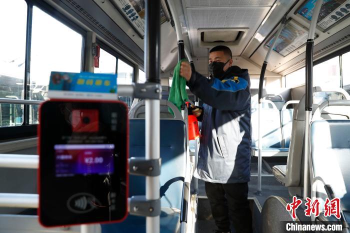 北京公交上岗人员一律佩戴口罩。图为工作人员对车厢内扶手进行消毒。 中新社记者 韩海丹 摄