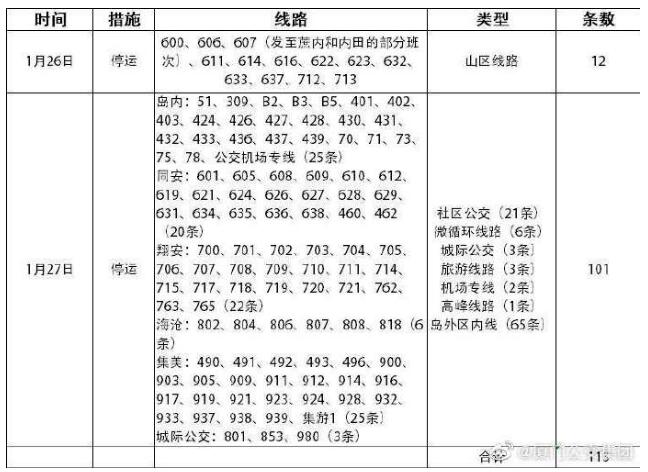 为全力做好新型冠状病毒感染的肺炎疫情防控工作,今明两天(1月26日至27日)起,厦门公交暂停运营113条公交线路,具体停运线路详见下图,恢复运行时间待另行通知。