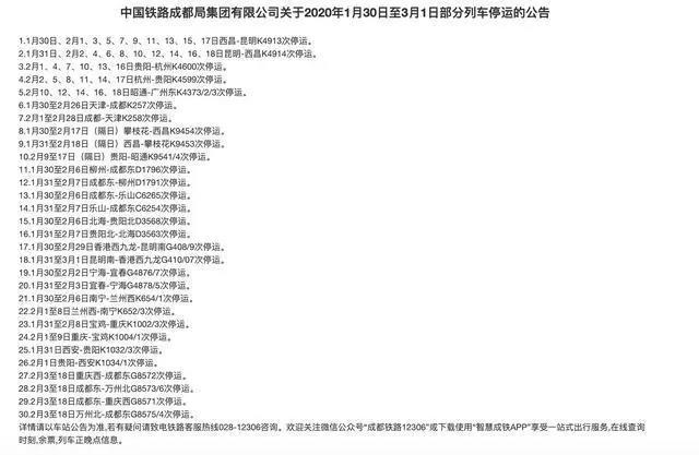 1月29至2月8日,昆明至西昌K4146次,1月29至2月9日,西昌至昆明K4145次停运;