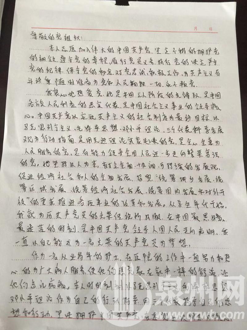 这其中,来自泉州我市8名医护人员有两名党员,其他6名医护人员都递交了入党申请。“我自愿加入中国共产党!”“请党组织在实践中考验我!”一份份申请书充满真挚的情感。