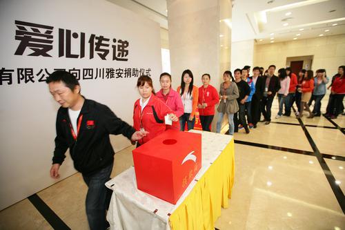 2013年4月21日,安踏体育用品有限公司举行向四川雅安震区捐助仪式,企业员工踊跃捐款,奉献爱心。(陈起拓 摄)